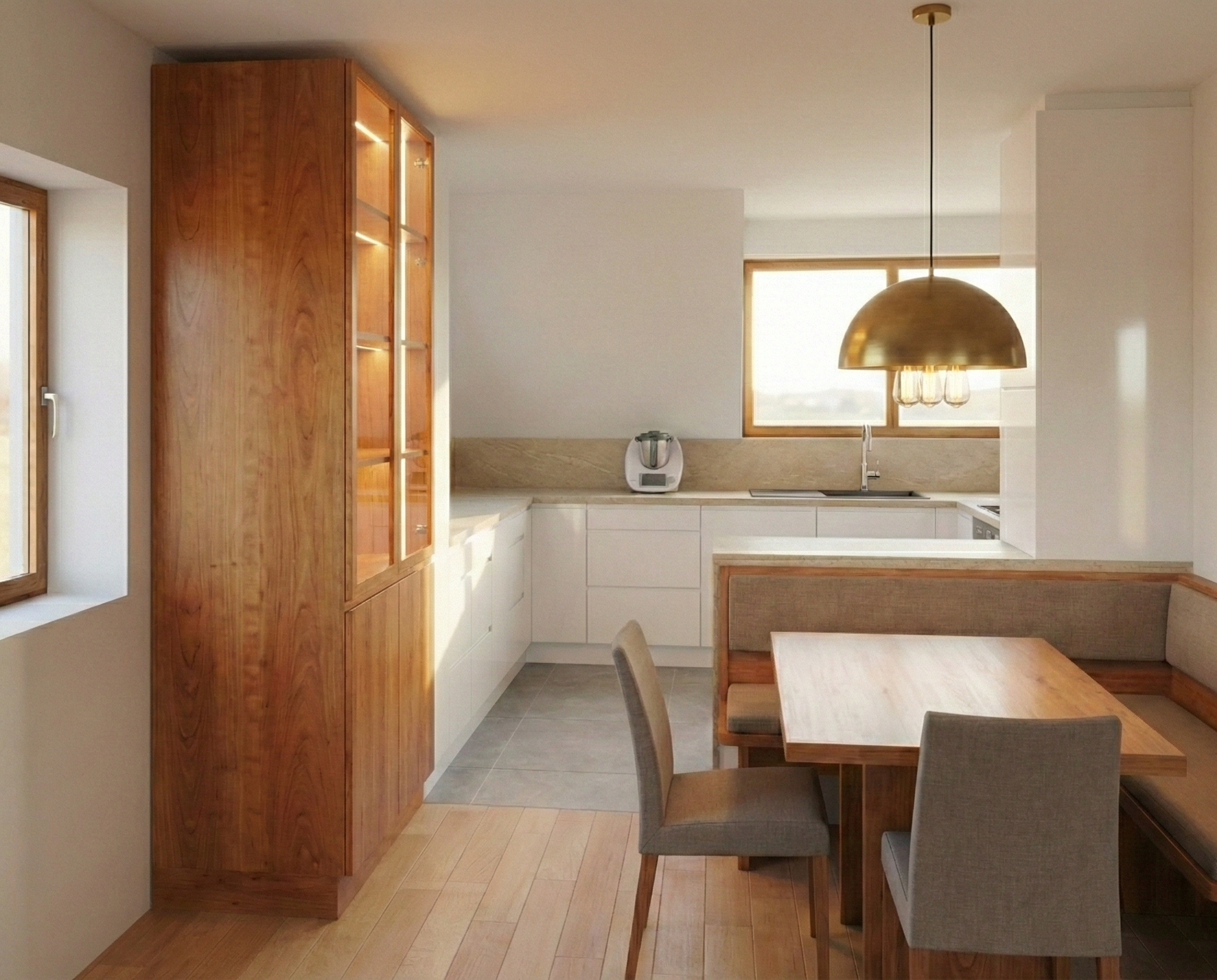 Maßgefertigte Möbel schaffen Struktur und Stauraum, ohne den Raum zu beschweren. Der Wohnzimmerschrank fügt sich harmonisch in das Gesamtbild ein und sorgt für Ruhe und Ordnung. Ein besonderes Detail ist das Sitzfenster – ein Rückzugsort, der dem Raum Wärme und Persönlichkeit verleiht.