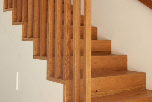 In diesem Wohnprojekt wurde die Treppe zum zentralen Gestaltungselement des Eingangs- und Wohnbereichs. Ziel war es, Architektur, Funktion und Materialität so miteinander zu verbinden, dass ein harmonisches Gesamtbild entsteht. Die Treppe sollte optisch wie aus einem Guss wirken – inklusive Stufen, Geländer und der angrenzenden Einbaumöbel. Gleichzeitig sollte der Raum unter der Treppenschräge effizient genutzt werden, ohne die Bewegungsfreiheit im Alltag einzuschränken.