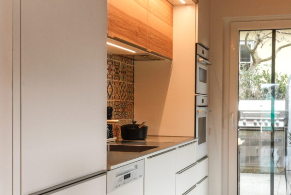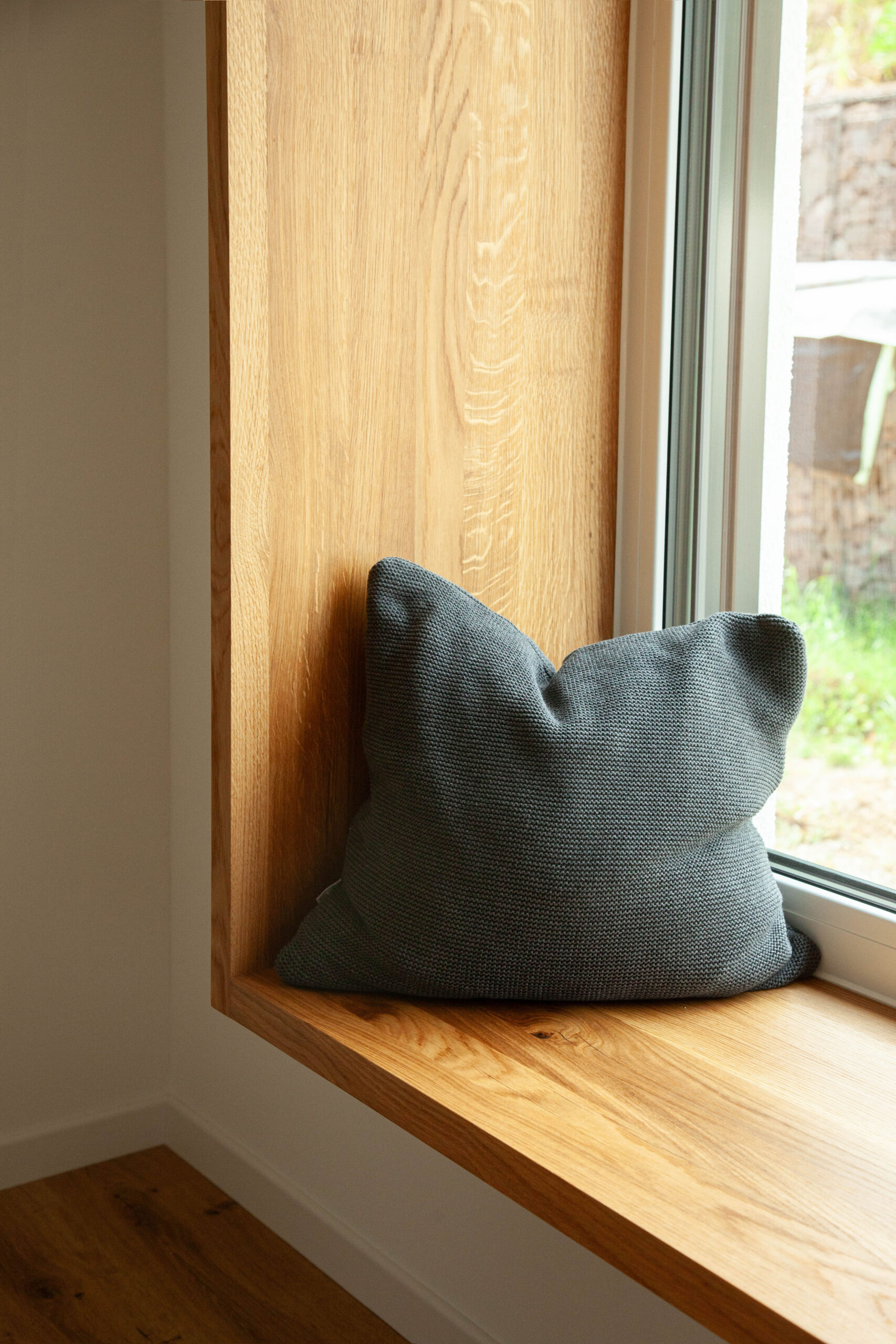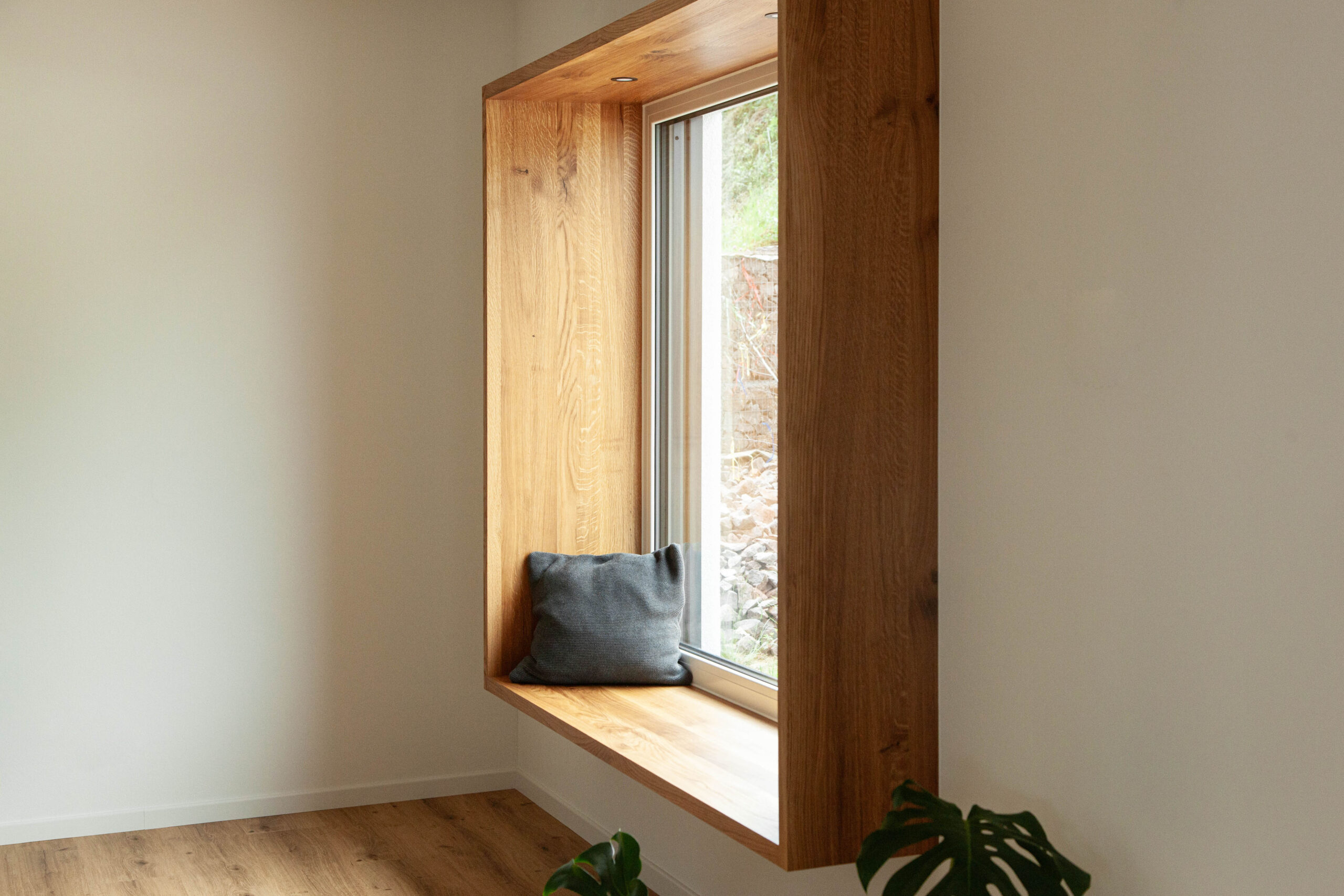 Durch eine maßgefertigte Stauraumlösung und ein integriertes Sitzfenster mit stimmungsvoller Beleuchtung entstand ein durchdachtes Zusammenspiel aus Design und Funktion. Die warme Eiche zieht sich als verbindendes Element durch alle Bereiche und schafft einen ruhigen roten Faden in der gesamten Gestaltung. So vereint das Projekt klare Linien, praktische Lösungen und eine wohnliche Atmosphäre – perfekt angepasst an die Bedürfnisse der Bewohner.