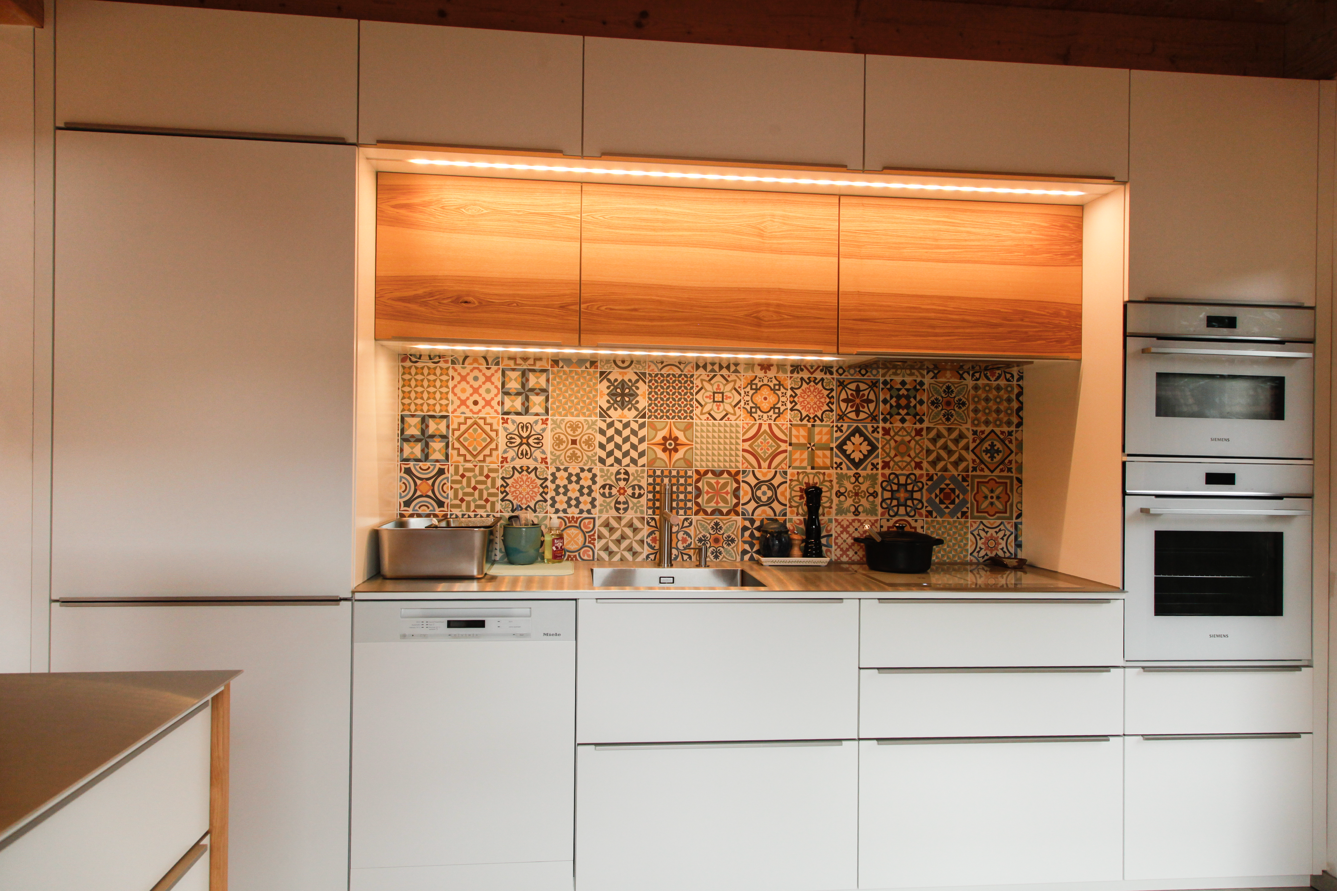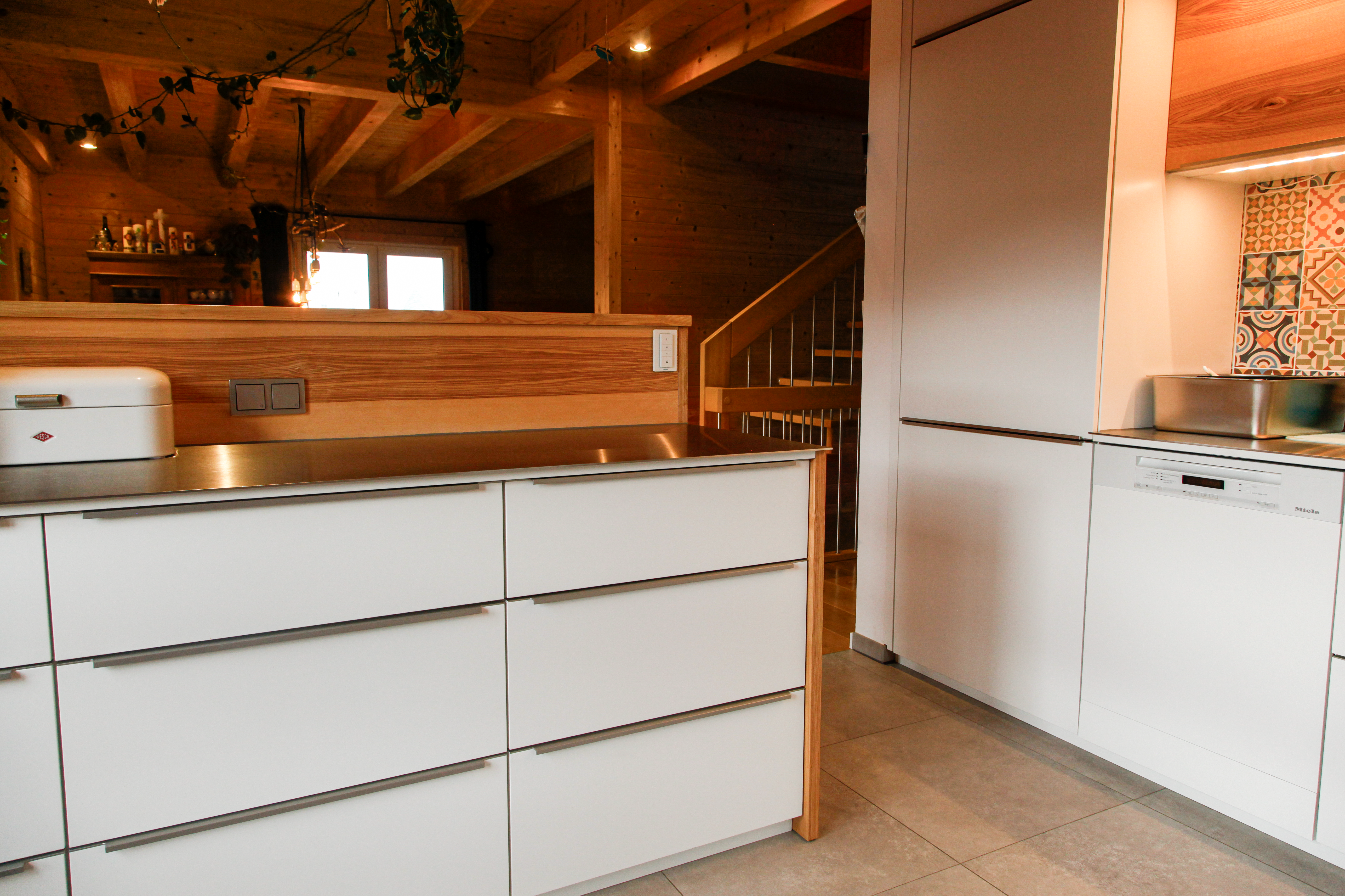 Für dieses Projekt wurde eine vollständig maßgefertigte Küche realisiert, die passgenau in eine bestehende Nische unter sichtbaren Deckenbalken integriert ist. Die Planung berücksichtigte den offenen Grundriss ebenso wie vorhandene Elemente: Die bestehenden Fliesen wurden vollständig erhalten und in das neue Küchendesign eingebunden. Eine individuell gefertigte Theke übernimmt die räumliche Trennung zwischen Küche und Wohnbereich und vereint mehrere Funktionen in einem Möbel. Ergänzt wird die Küche durch ein Highboard mit integriertem Weinkühlschrank sowie einen Flurschrank mit verdeckter Technik und durchdachter Innenorganisation.