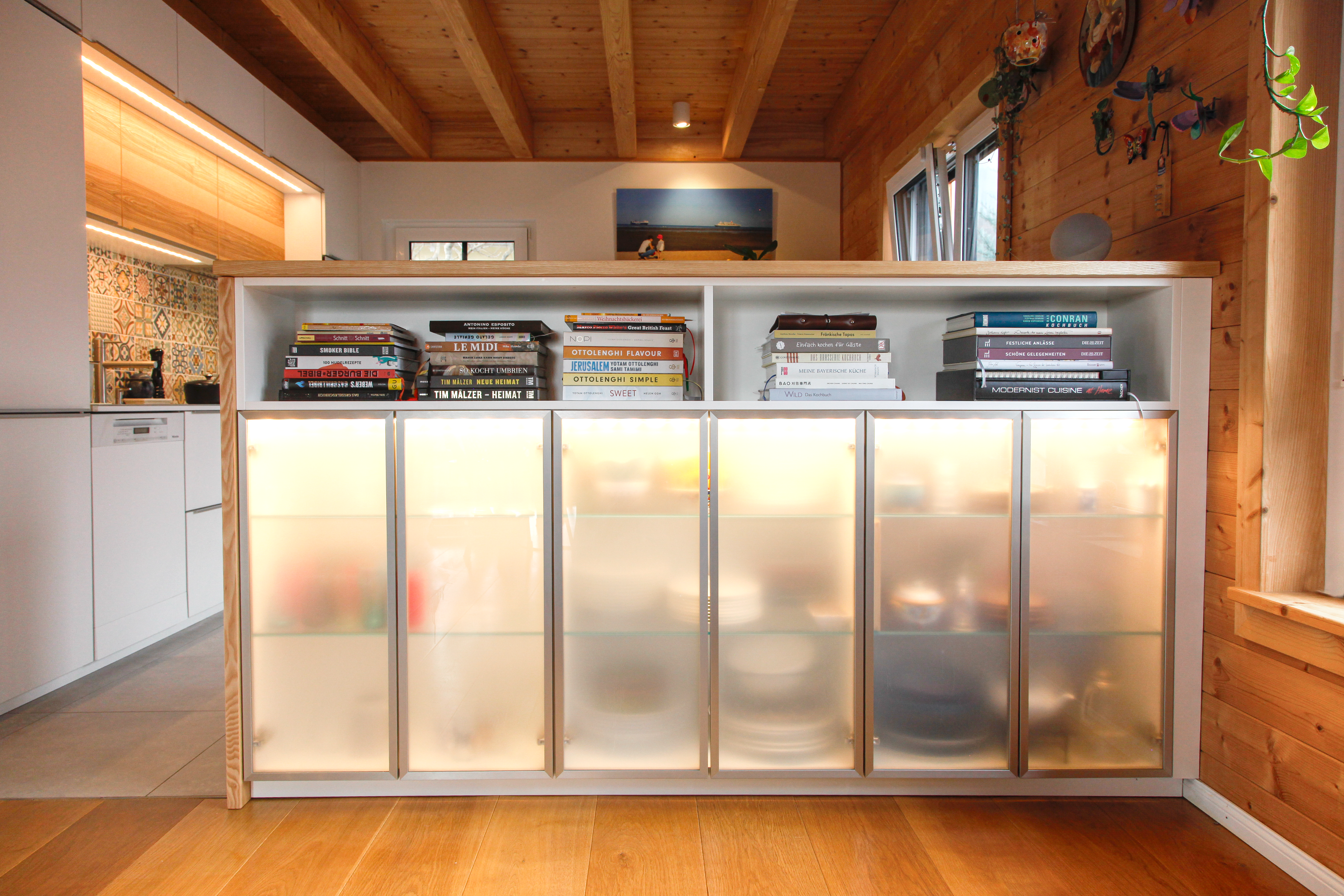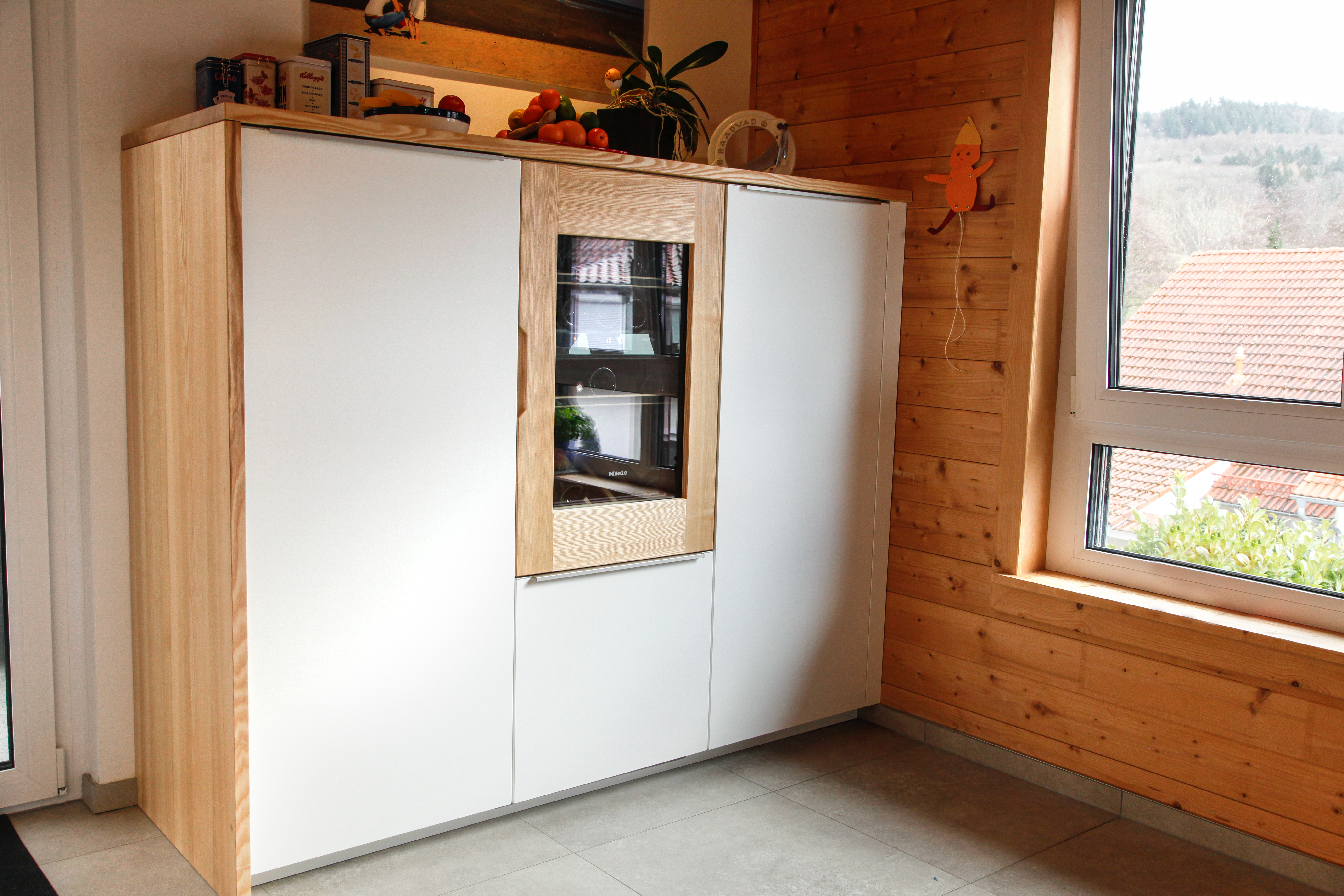 Ein ganzheitliches Einrichtungskonzept, das handwerkliche Präzision mit zeitloser Gestaltung verbindet. Die Küche fügt sich selbstverständlich in den Raum ein und überzeugt durch eine ruhige, hochwertige Anmutung bis ins kleinste Detail. Passend dazu wurde auch das angrenzende Highboard gestaltet – mit einem elegant integrierten Weinkühlschrank, eingefasst in einen Rahmen aus massivem Eschenholz.