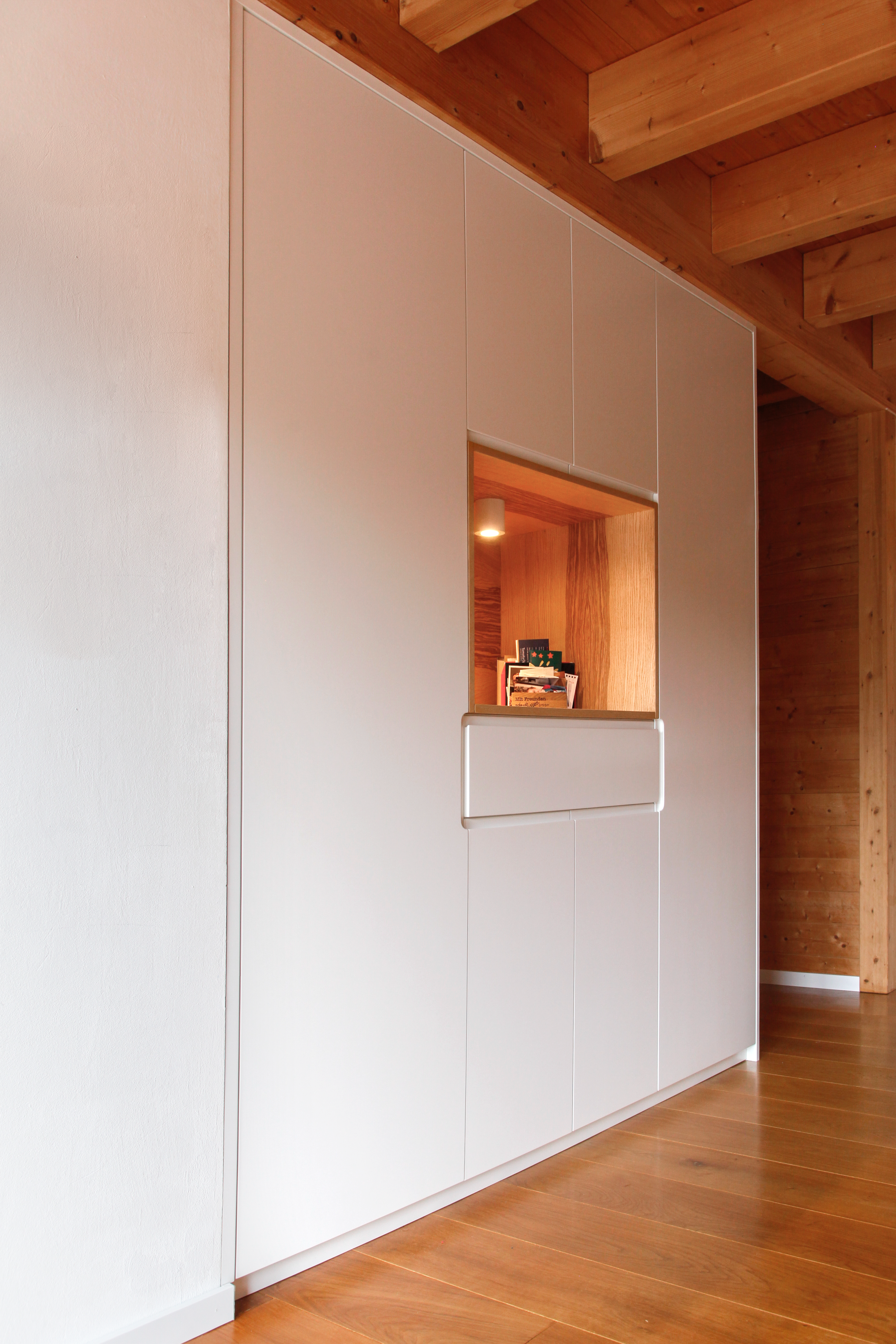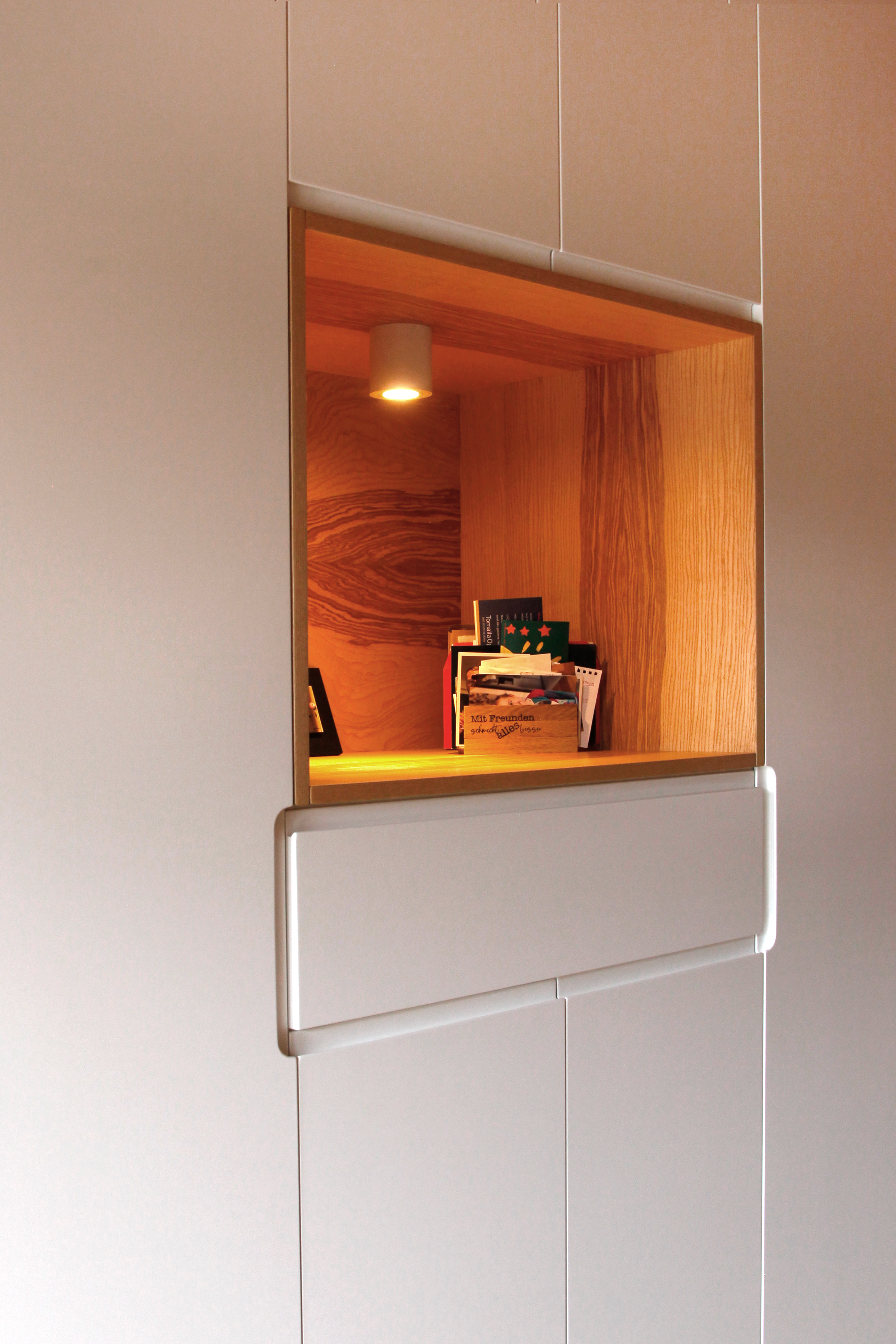Das Projekt bestand darin, eine maßgefertigte Küche mit Echtholz Akzenten in eine bestehende Nische unter sichtbaren Deckenbalken zu integrieren. Eine hauchdünne Arbeitsplatte sollte einen eleganten Look kreieren. Gleichzeitig sollten vorhandene Fliesen integriert werden. Der Wunsch für den Flurschrank war die Integration von Telefon, Drucker, Staubsauge, Beleuchtung und einer Magnettafel.