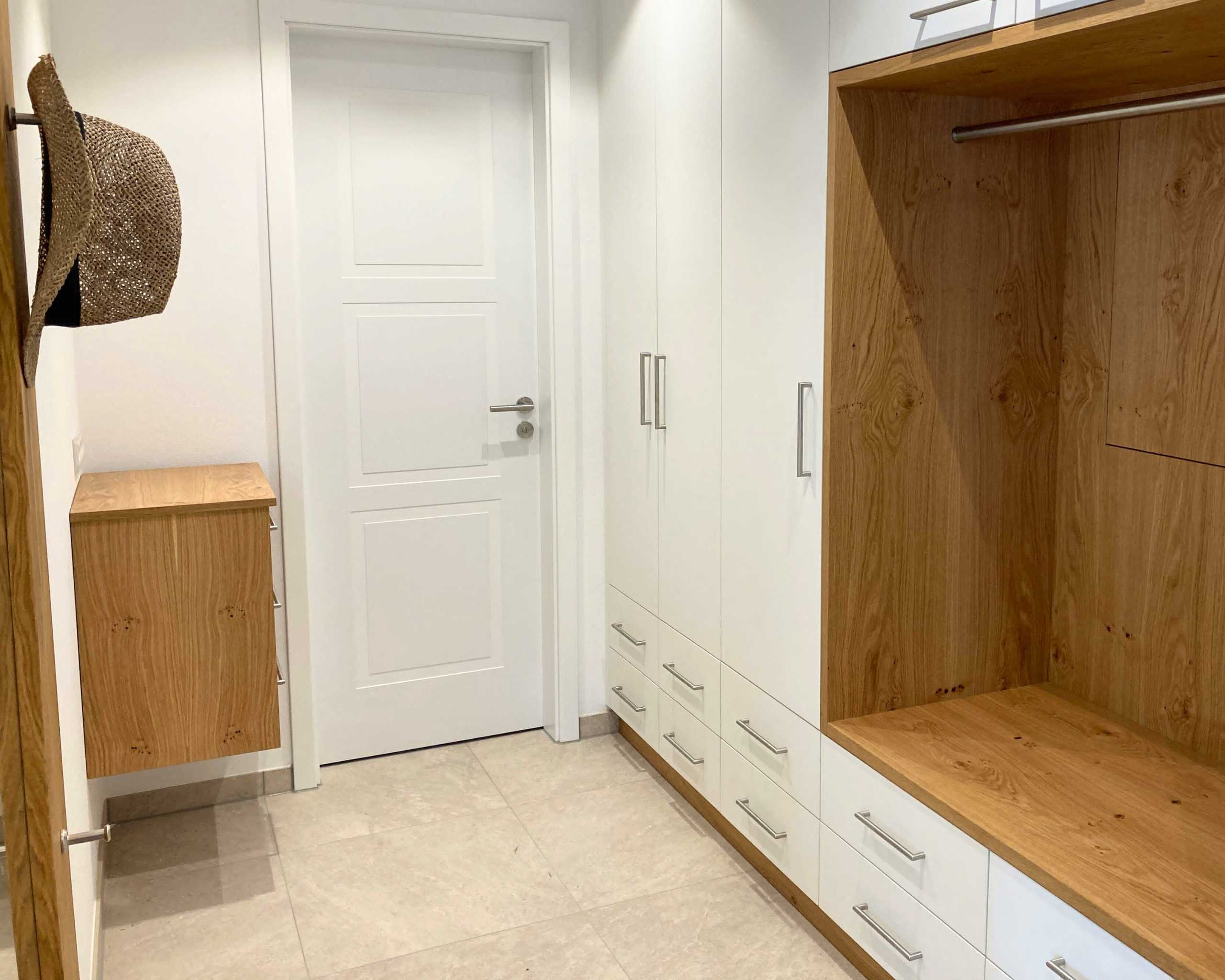 Der Flur ist der erste Eindruck Ihres Zuhauses. Wir gestalten Garderoben, die Stauraum schaffen und jede Funktion bieten,die Sie benötigen. Egal ob integrierte Sitzbank, Spiegel oder versteckte Raumtechnik.
