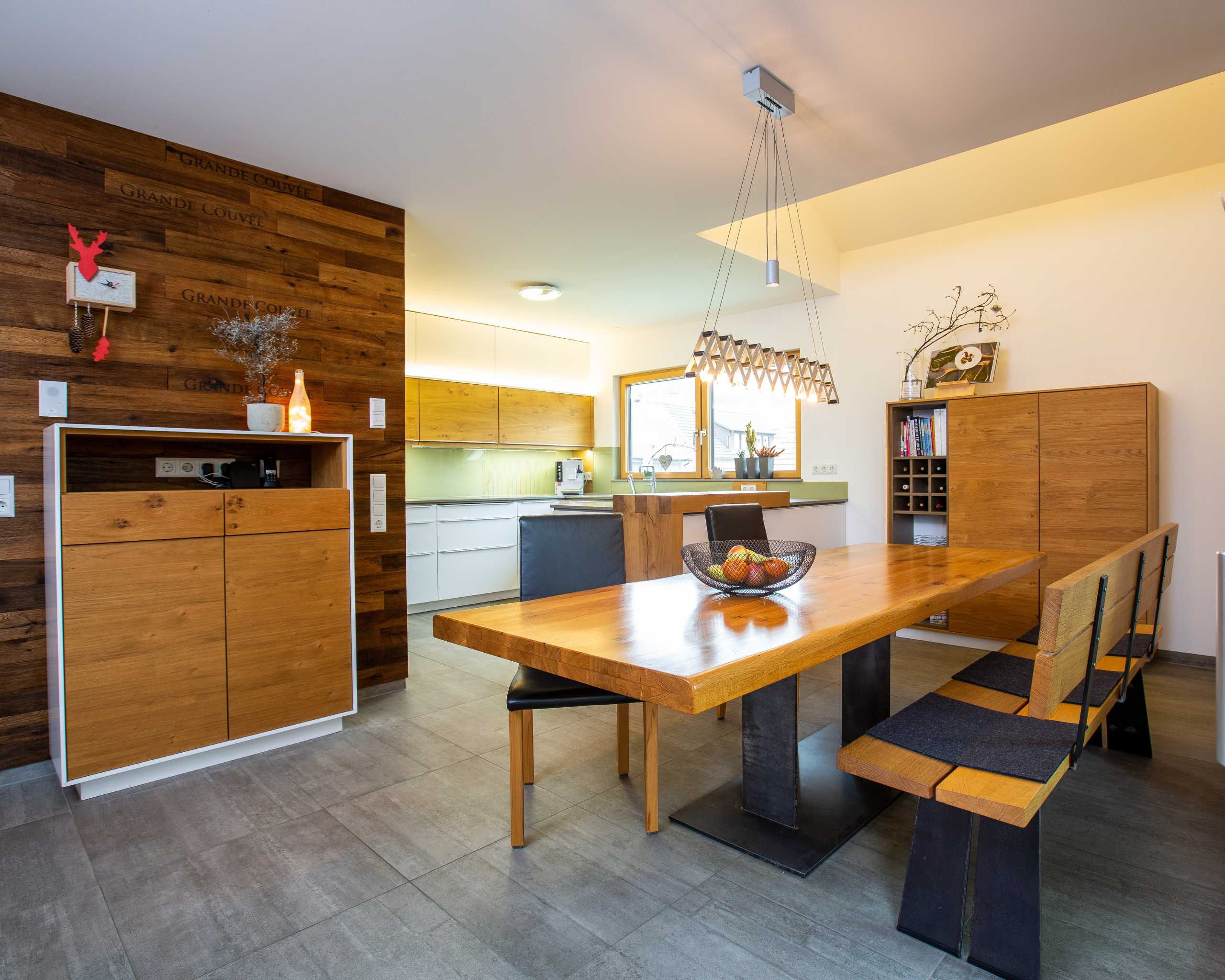 Ein Tisch, der zum Mittelpunkt wird, ergänzt durch eine eingepasste Sitzbank oder gepolsterte Stühle. Mit unseren individuell gefertigten Tischen, Sitzmöbeln und Stauraumlösungen schaffen wir einen Ort zum Genießen und Zusammensein.