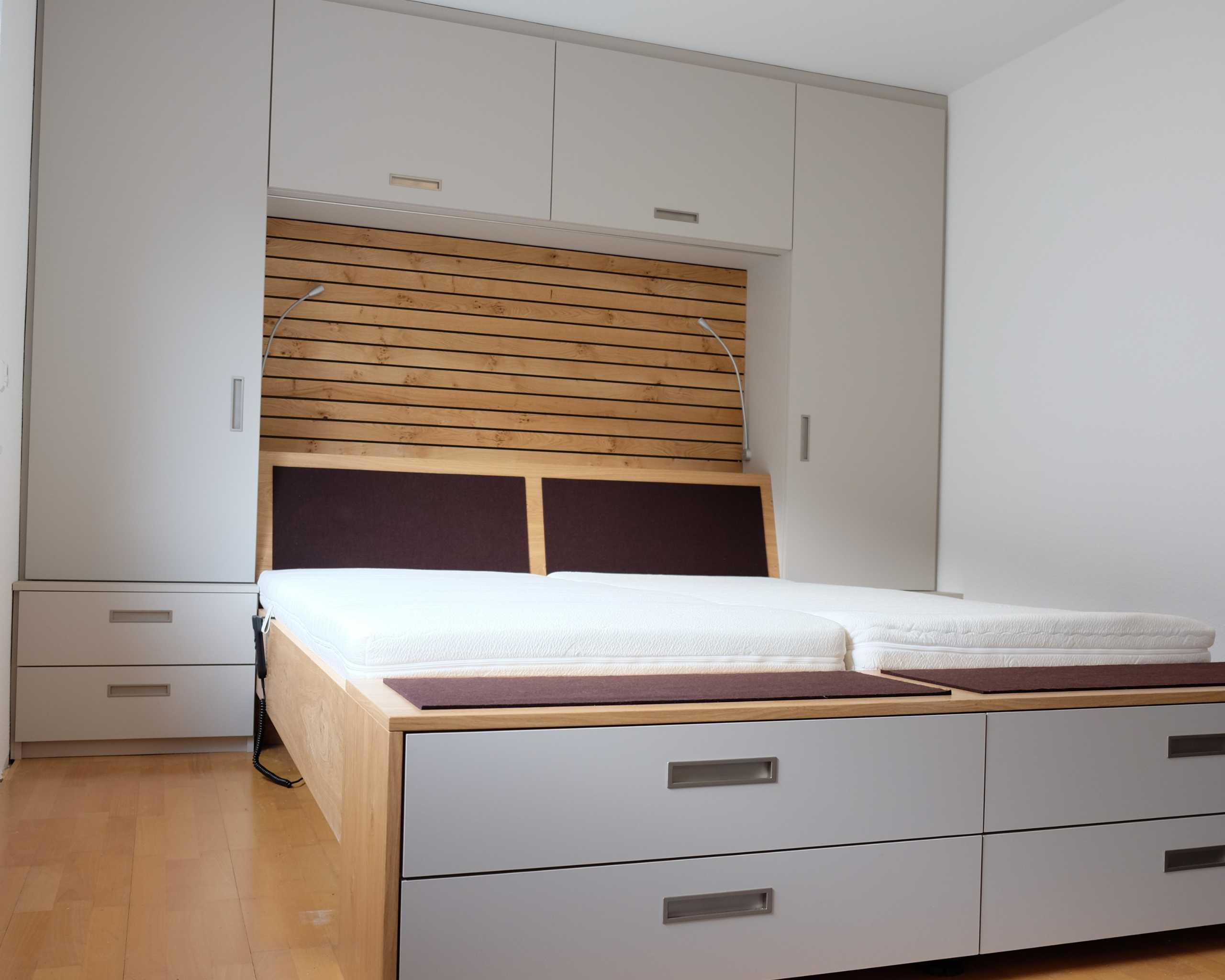 Ein ruhiger, klar gestalteter Schlafraum beginnt bei durchdachten Möbeln. Wir bauen Betten mit zusätzlich rückenschonenden Lattenrosten oder Stauraum mit zugehörigem Innenleben ganz auf Sie abgestimmt.