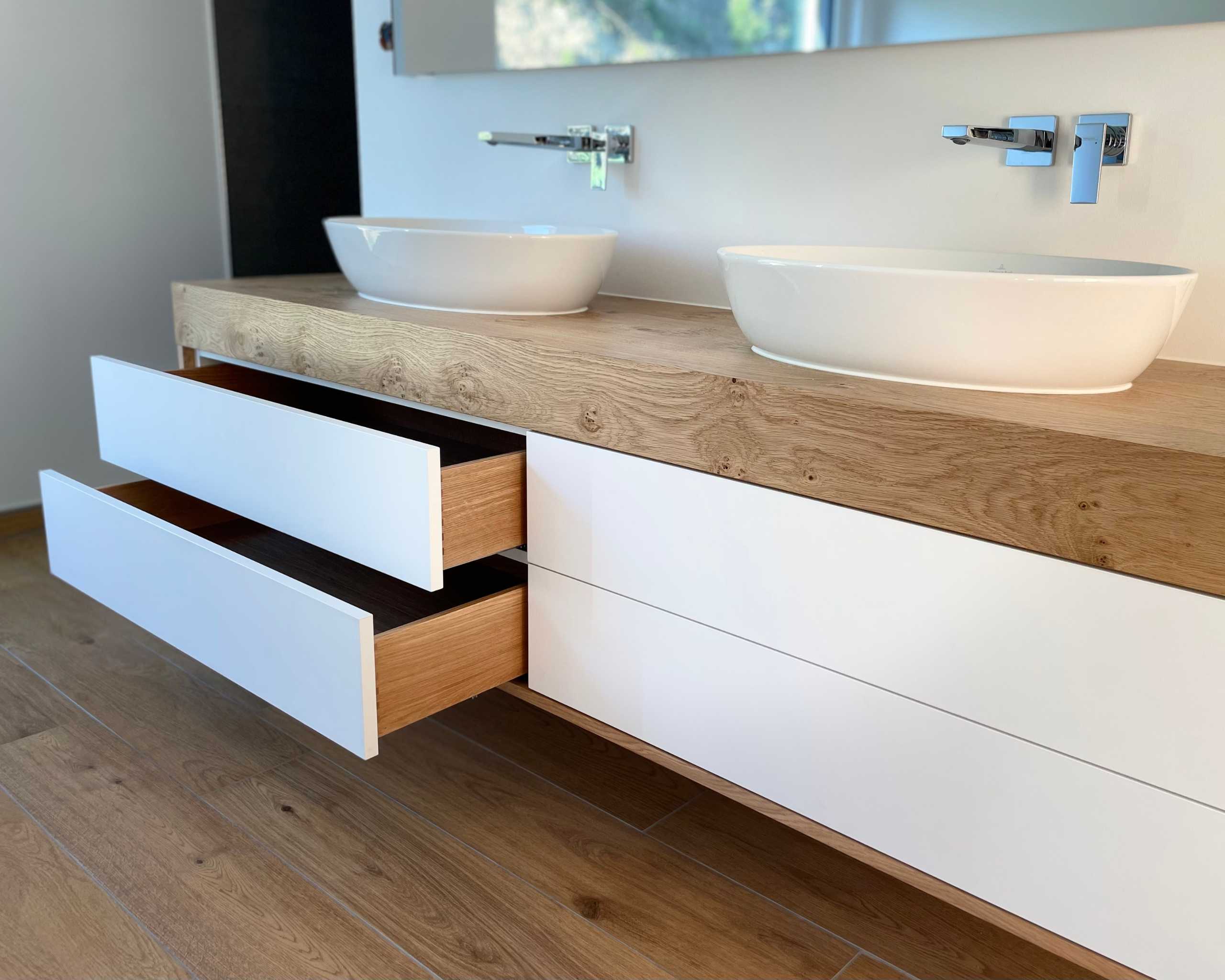 Wir bieten spezielle feuchtraumgeeignete Lösungen für Ihr Badezimmer an. Außerdem statten wir individuelle Spiegelschränke mit zusätzlicher Beleuchtung aus.